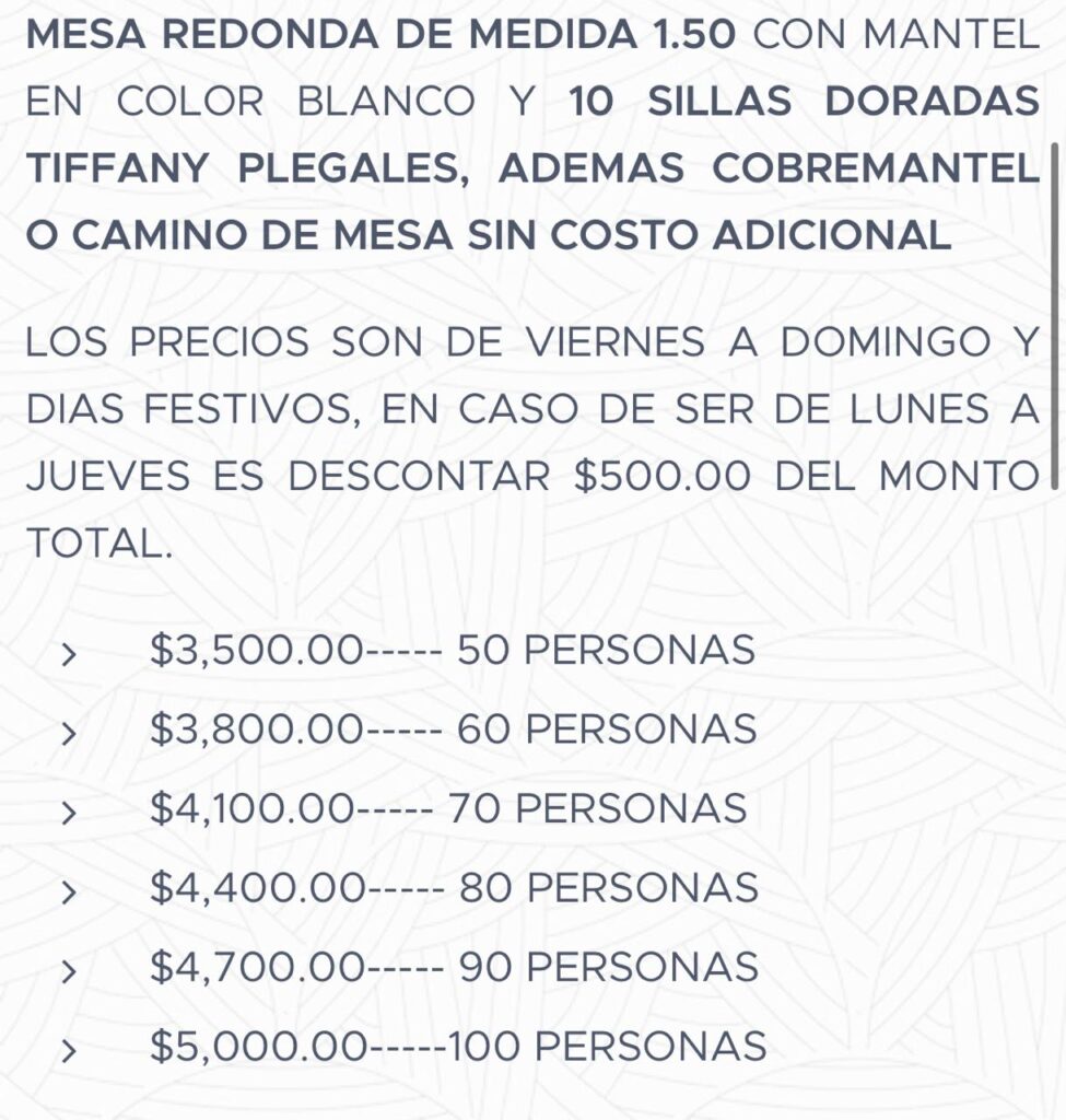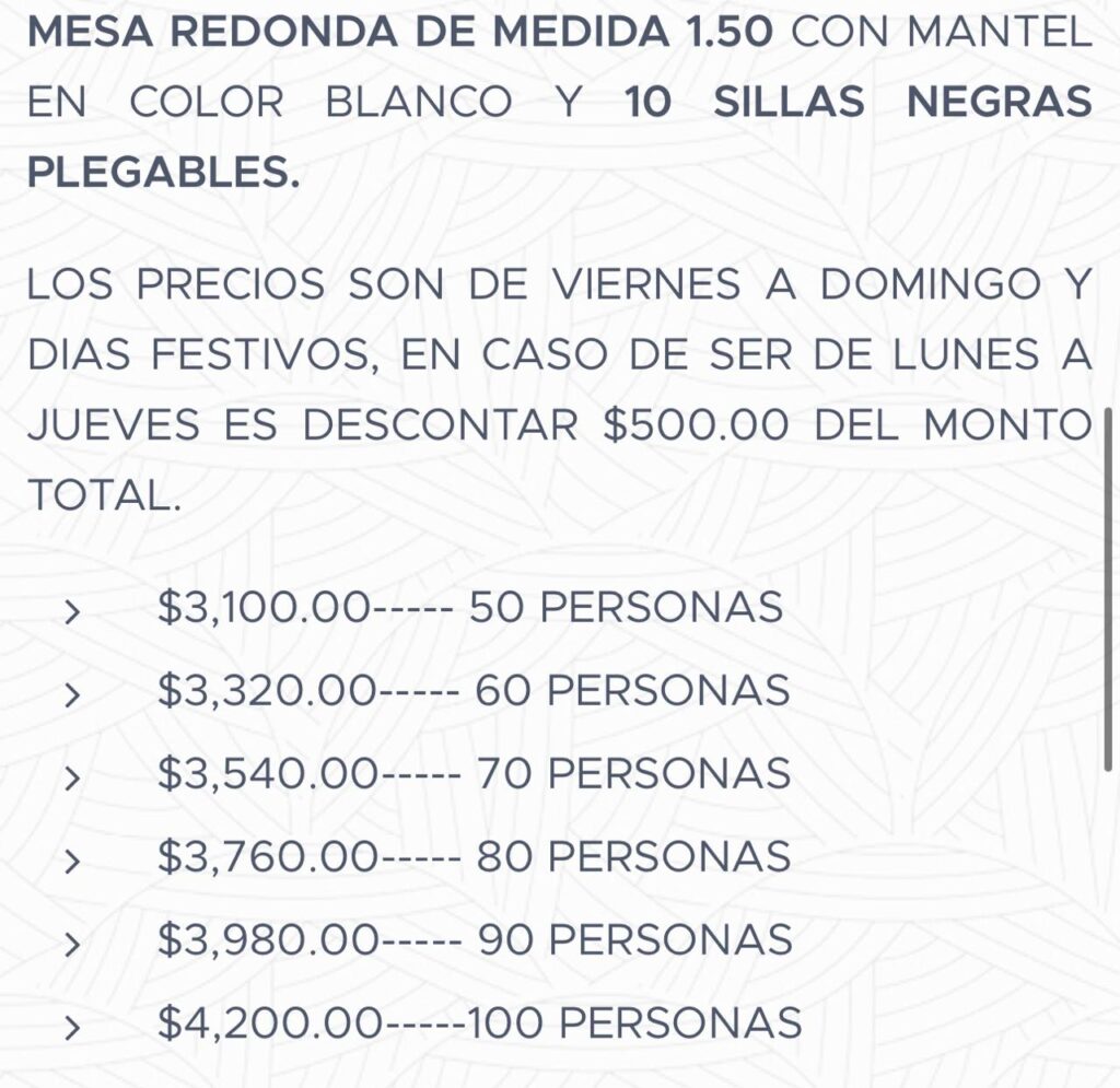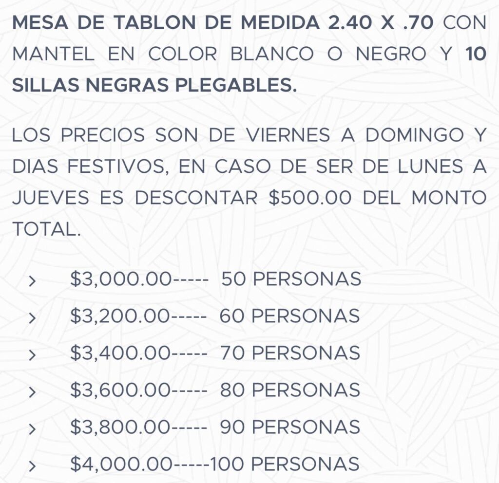 EL PAQUETE MAS BÁSICO ES PARA 50 PERSONAS, EN CASO DE QUE SEAN MENOS TENDRA EL MISMO COSTO.