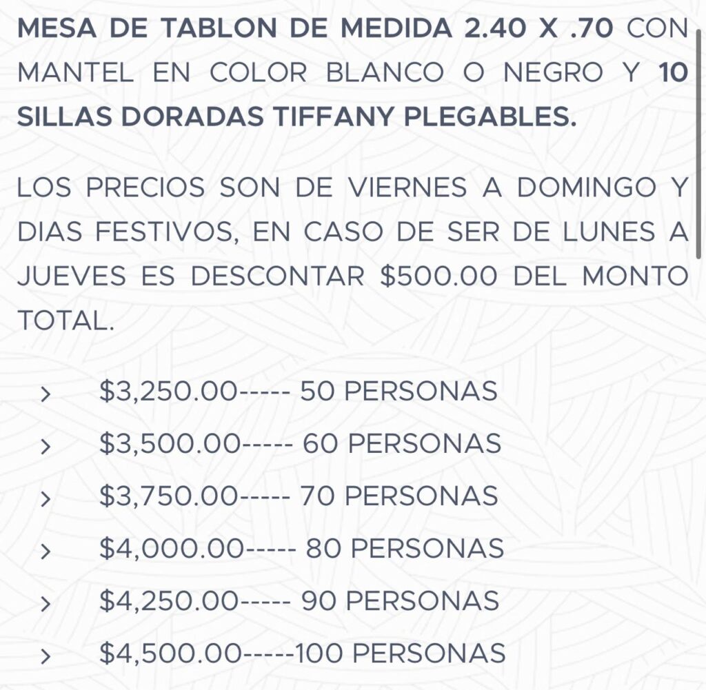 - $ 400.00—–HORA EXTRA DESPUES DE LAS 23:00 DEL MISMO DIA DEL EVENTO.